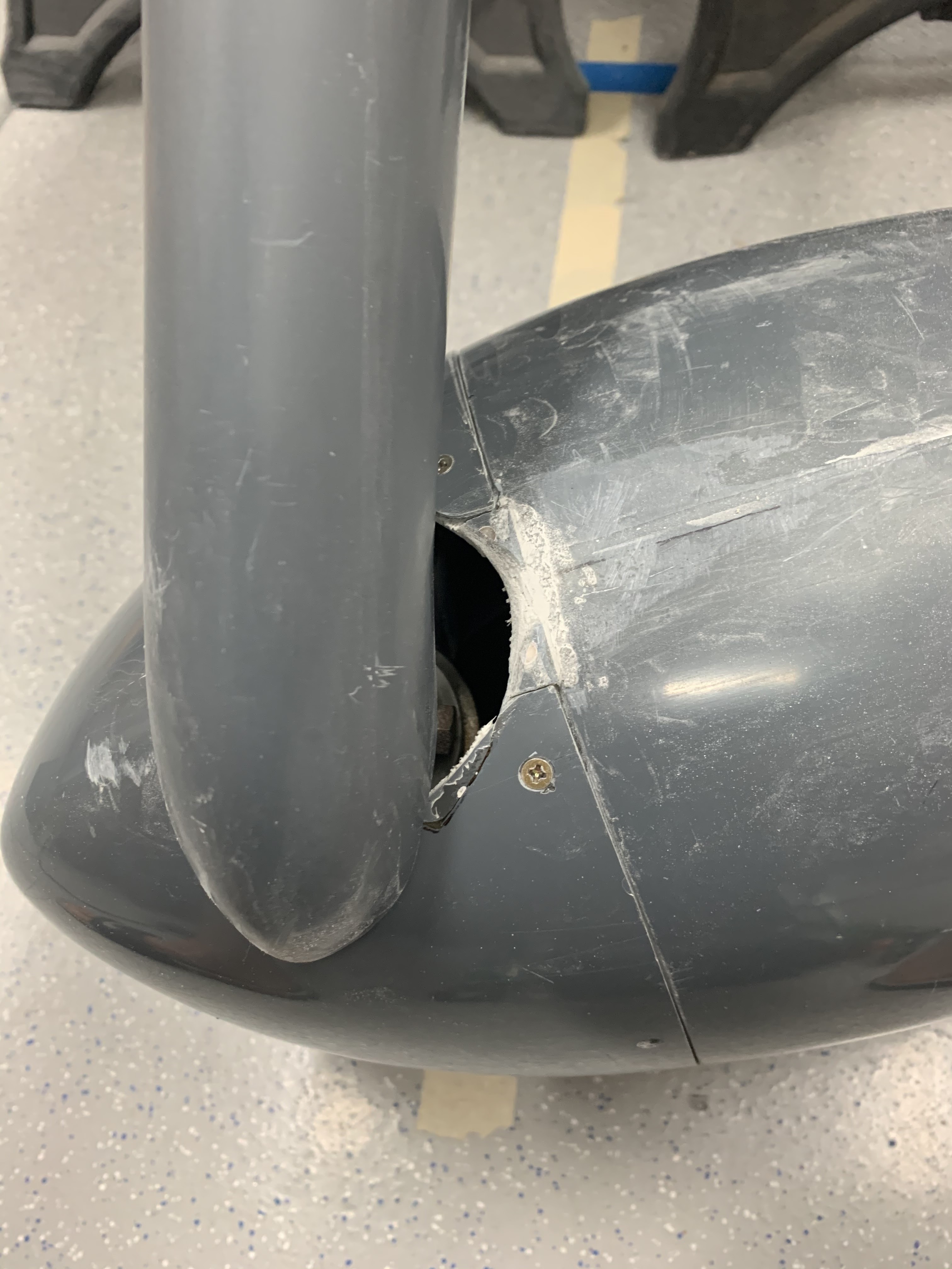 In order to have proper clearance when the nose wheel is turned to full deflection, a little more material has to be removed from the opening in the front half of the nose gear fairing. It ended up being close to a circular opening. My initial assessment of the contact areas was geometrically incorrect, so you can see in the photo below that I had to glass a few pieces back in to minimize the open area.